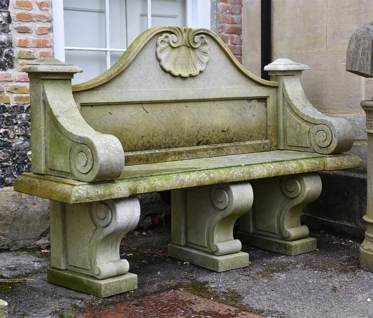 A STONE COMPOSITION GARDEN SEAT IN GEORGE II STYLE OF RECENT MANUFACTURE AND AFTER WILLIAM KENT 128.5cm high, 183cm wide, 55cm deepCondition Report: Marks, knocks, scratches, abrasions consistent with age and useThe surface with weathering and wear, also green algae and other discolouration, the adhesive/mortar has failed and is peeling off, there is also signs of mastic/composition to the joints which will need cleaning off and re-securing - overall Dreweatts suggests this gets rebuilt and fully constructed before use in a garden setting. Overall with an appearance inkeeping with age, use, and continued storage in an exterior settingOverall this is sold disassembled Please refer to additional images for visual reference to condition Condition Report Disclaimer