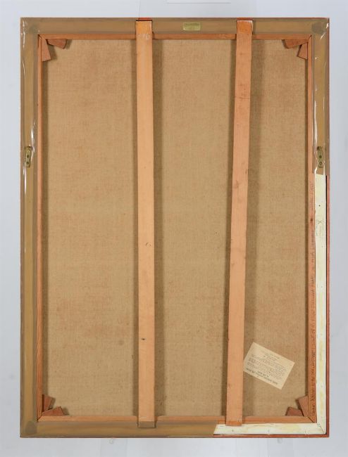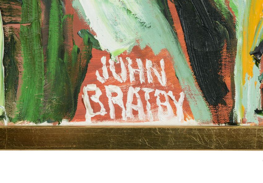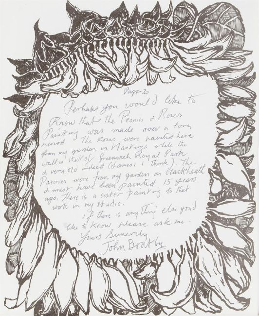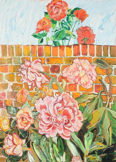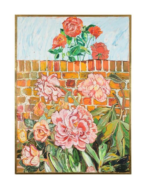 λ JOHN BRATBY (BRITISH 1928-1992)PEONIES AND ROSES Oil on canvas Signed (lower centre); titled Paeonies [sic] and Roses by the Old Jacobean Wall of the Royal Greenwich Park in High Summer and dated 1968 to stretcher (verso)121.5 x 85cm (47¾ x 33¼ in.) Exhibited:London, Royal Academy of Arts, Summer Exhibition, 1981, no. 998The present lot was painted over a long period of time. The roses came from the artist's garden in Hastings. The wall in the background is in fact from the Greenwich Royal Park. The Peonies were painted 15 years prior to the completion of the painting and came from the artist's garden on Blackheath. There is a sister painting to the current lot which in 1981 was sat in the artist's studio. Condition Report: In good original condition. Inspection under UV reveals no obvious evidence of restoration or repair. Condition Report Disclaimer