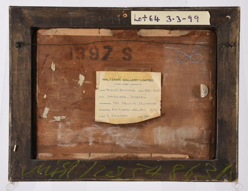 MALCOLM DRUMMOND (BRITISH 1880-1945)LANDSCAPE, DONEGAL Oil on panel 25 x 35cm (9¾ x 13¾ in.)Provenance:Mrs Malcolm Drummond, Private CollectionD. Hackman, Private Collection Maltzahn Gallery Ltd., London Sale, Christie's, London, 20 September 1990, lot 185Sale, Sotheby's, London, 3 March 1999, lot 64Exhibited:London, Maltzahn Gallery Ltd., May 1974Condition Report: The paint surface is dirty. Ultraviolet light reveals scattered retouching notably to the lower right corner, along the edges as well as in the sky. Otherwise, in generally good condition, may benefit from a light clean.Condition Report Disclaimer