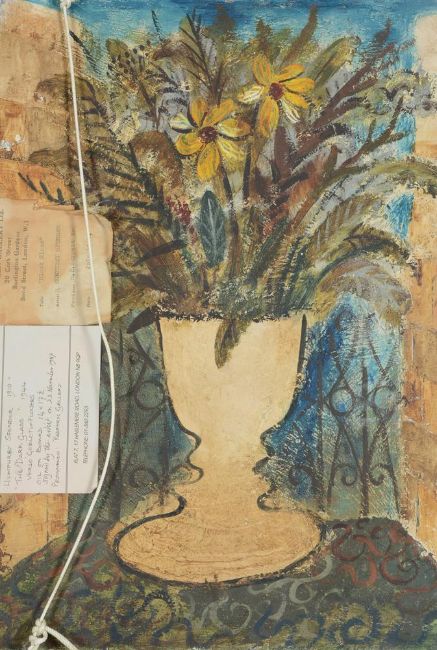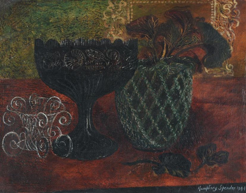 λ JOHN HUMPHREY SPENDER (BRITISH 1910-2005)THE DARK GLASS Oil on boardSigned and dated 1944 (lower right)35.5 x 46cm (13¾ x 18 in.)Provenance:Redfern Gallery, LondonPrivate collection, H. E. Burrett (acquired from the above in 1944)Sandra Lummis Fine Art, London With a sketch of a still life of flowers on the reverse.