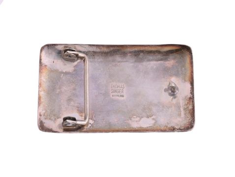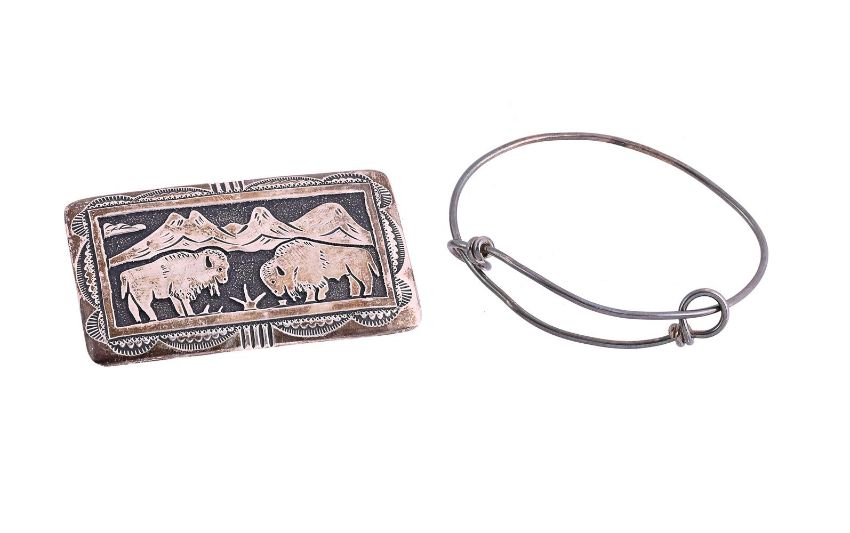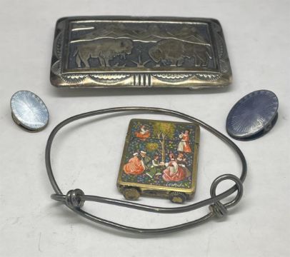 A SMALL COLLECTION OF SILVER ITEMS Comprising a North American Navaho silver coloured belt buckle by Thomas Singer; a silver lighter retailed by Asprey & Co. Ltd, London 1935 import mark, the front with a painted scene of a celebration in a forest, with additional 935 and STERLING stamps; two silver enamelled oval clips, circa 1920 with French import marks; and a silver coloured wire bangleSize/dimensions: buckle 7.6cm wide; lighter 3.5cm highGross weight: 78 gramsProvenance:By family descent and sold by order of a member of the de Rothschild FamilyRenée Louise Marie de Rothschild (1927-2015) was the daughter of Anthony Gustav de Rothschild and Yvonne Lydia Louise de Rothschild (née Cahen d'Anvers). In 1955 Renée married the British equestrian and Olympic show jumping medallist Peter Robeson. Together Peter and Renée became hugely successful racehorse trainers from their stud at Tyringham in Buckinghamshire Condition Report: This lot is sold as found, please refer to condition imagesCondition Report Disclaimer