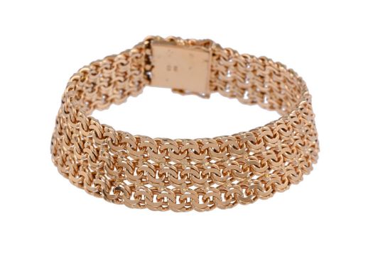 A BROAD GOLD COLOURED BRACELETThe polished interlocking links to a concealed clasp, stamped 750 and CBSize/dimensions: 19.1cm long, 1.8cm wideGross weight: 54 grams
