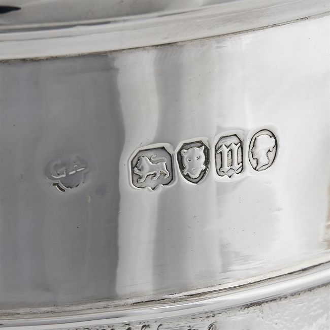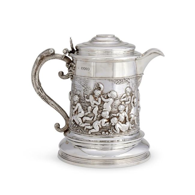 A VICTORIAN SILVER LIDDED TANKARDGEORGE ANGELL & CO., LONDON 1868The ogee domed cover with a shell thumb piece and engraved with a crest, motto and monogram, the body with a grape vine scroll handle and embossed with putti23cm (9in) high1495g (48.05 oz)The arms of the OPPENHEIM family whose origin is in Windeck an der Sieg, Rossel Germany, formerly Poland. The arms for this family are of German origin. The owner of the tankard is likely to be Henry Maurice William OPPENHEIM (1835-1912) who was born in Frankfurt, Germany the son of Simon Lazarus OPPENHEIM by Hannchen SCHIFF. Notably in 1868 he married Isabella Georgina BUTLER (1843-1933) daughter of James BUTLER of Lamberton Park, Queens Co. Ireland. Which suggests that this may be a marriage gift with an assay date also for 1868. In 1856 Henry Maurice William OPPENHEIM became a British citizen and was later of 16 Burton Street, London W. Blazon of the crest (as seen): a horse's head erased Motto: CONSTANTIA ET LABORE Condition Report: Maker's mark to body partially rubbed, rest are clearPlay to the hingeCover sits wellEngraving crispEmbossed decoration goodStands wellLight scratches and wear commensurate with age and useCondition Report Disclaimer