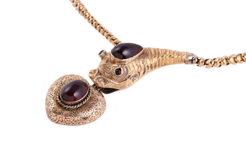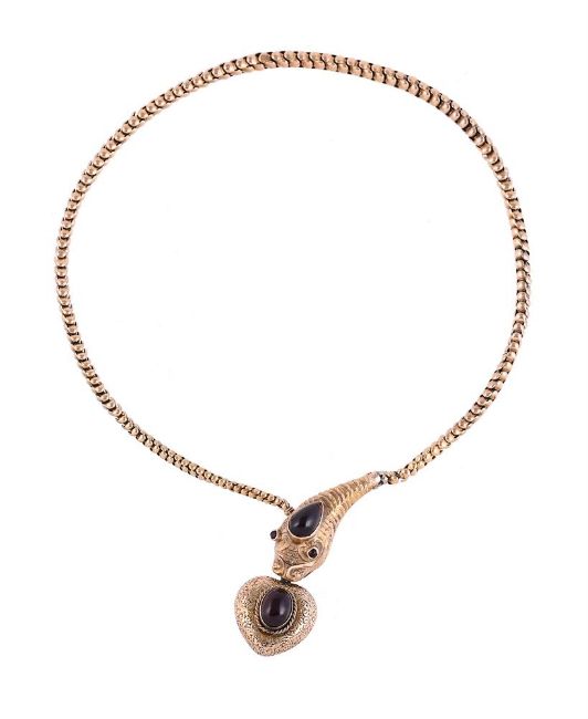 A VICTORIAN GOLD AND GARNET SERPENT NECKLACE CIRCA 1880The textured serpents head set with a pear shaped cabochon garnet and circular cabochon garnet eyes, to a graduated polished serpent link chain, with concealed clasp, suspending an oval cabochon garnet set heart shaped locket, with floral decoration, glazed panel verso Size/dimensions: 36.5cm long Gross weight: 17.3 gramsCondition Report: The necklace appears to have been crushed slightly and has had some repairs, the crushing is mostly to the reverse of the snakes head, there is a repair at the end of the snake link/ base of the snakes head where it joins, there is lead solder at the top of the heart locket, the glazed panel at the back of the locket has scratches and some small patches of the lead solder and scratches to the back and side of the setting. Some bends to the links, but still useableCondition Report Disclaimer