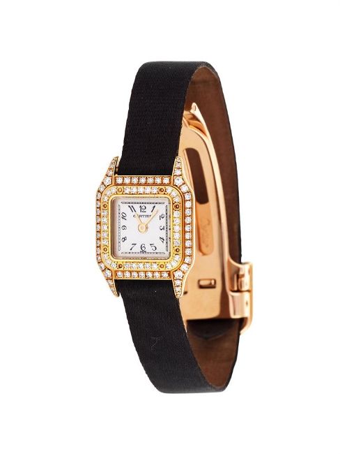 CARTIER, PANTHÈRE, REF. 2360A LADY'S 18 CARAT GOLD AND DIAMOND WRIST WATCH, NO. CC485916Movement: Cal. 201, quartz, 4 jewelsCase: 18 carat gold case, diamond set bezel and lugs, screwed down case back with back set, stamped with 18 carat gold common control markDial: SilveredStrap: Cartier black satin and leather strap with an 18 carat gold deployant claspSize: 17mmSigned: Case, dial, movement, strap, claspAccessories: NoneCondition Report: In our opinion this watch dates to circa 2000Movement is currently functioning. Movement appears to be in a generally good condition with little sign of previous intervention when viewed under a 4x loupe. Dial appears to be in a generally good condition with no marks visible when viewed under a 4x loupe. Hands appear to be in a generally good condition.Glass appears free of significant scratches or marks when viewed under a 4x loupe. Case appears to be in good condition with minor scratches and marks. Crown has light scratches when viewed under a 4x loupe. Strap appears to be in good condition with minor marks and creasing. Buckle appears to be in good condition with minor marks and scratches when viewed under a 4x loupe.25g grossThis lot does not come with box or papers.Dreweatts 1759 do not guarantee the working order or accuracy of any lots sold. Due to opening of the case back we recommend this watch is re-sealed by a qualified technician to ensure any stated water resistance is achieved.If you should have any further questions regarding this lot, please contact the Watch Department on 01635 553 553 or at watches@dreweatts.com           Condition Report Disclaimer