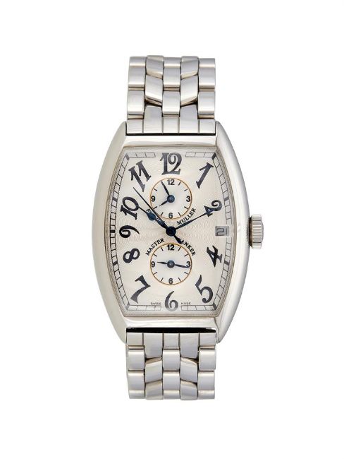 FRANCK MÜLLER, MASTER BANKER, REF. 5850MBA STAINLESS STEEL BRACELET WATCH WITH THREE TIME ZONES AND DATE, NO. 233, CIRCA 2000Movement: Cal. 2800, automaticCase: Stainless steel case, screwed down case back with four screwsDial: SilveredBracelet: Franck Müller stainless steel bracelet with concealed clasp Size: 32mm, bracelet 17cmSigned: Case, dial, movement, crown, claspAccessories: Frank Müller box, outer card packagingCondition Report: Movement is currently functioning. Movement appears to be in a generally good condition with little sign of previous intervention when viewed under a 4x loupe. Dial appears to be in a generally good condition with no marks visible when viewed under a 4x loupe. Hands appear to be in a generally good condition.Glass appears free of significant scratches or marks when viewed under a 4x loupe. Case appears to be in good condition with minor scratches and marks. Crown has light scratches when viewed under a 4x loupe. Bracelet has light scratches and some signs of light stretching to links. Clasp is currently functioning and appears to be in good condition. Bracelet measures approximately 17cm including case.This lot comes with a box but no papers.Dreweatts 1759 do not guarantee the working order or accuracy of any lots sold. Due to opening of the case back we recommend this watch is re-sealed by a qualified technician to ensure any stated water resistance is achieved.If you should have any further questions regarding this lot, please contact the Watch Department on 01635 553 553 or at watches@dreweatts.com           Condition Report Disclaimer