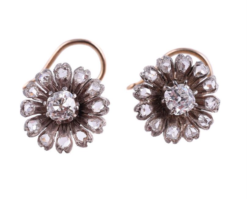 A PAIR OF LATE 19TH CENTURY AND LATER DIAMOND FLOWER HEAD CLUSTER EARRINGS The flower heads each centred with an old mine cut diamond, approximately 0.50 carats total, within a surround of rose cut diamond petals, with hooked stud fittingsSize/dimensions: 1.2cm diameterGross weight: 2.7 gramsCondition Report: One of the flower heads has had the diamond fitting repaired/replaced, the stud/hook fittings are not original, the settings look like they have had other repairs to the petals which are visible to the backs of the settings. The diamonds are bright and lively, the principal diamonds approximately I-J colour, clarity SI and I. Condition Report Disclaimer