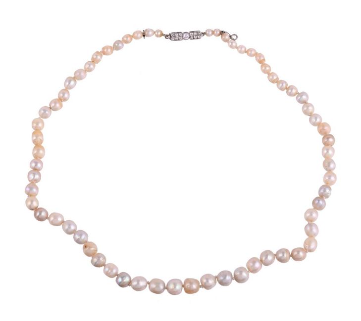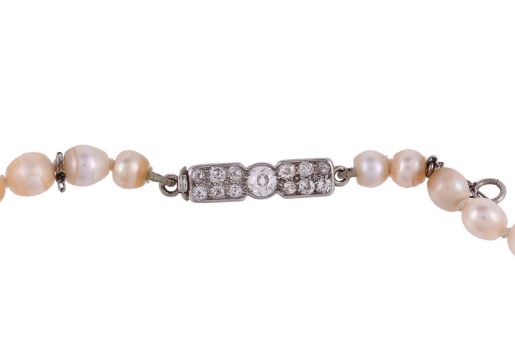 A NATURAL PEARL AND DIAMOND NECKLACEThe sixty three graduated natural pearls on a knotted strand to an old cut diamond clasp, approximately 0.24 carats totalSize/dimensions: pearls measure from approximately 4.27mm to 8.35mm, necklace 50cm longGross weight: 28.5 gramsOffered for sale with a Gemmological Certifications Services Pearl report Numbered 5782-2987, Date 05.09.2022, stating: Species Natural pearlVariety SaltwaterCondition Report: The pearls have a slight variation in body colour, most and white or creamy but some have a more silvery tone, there is wear to a number of the skins, some pearls are tonneau shaped due to the amount of wear, some cracks and pits to the skins, some flaking. A variation in lustre across the pearls.Condition Report Disclaimer
