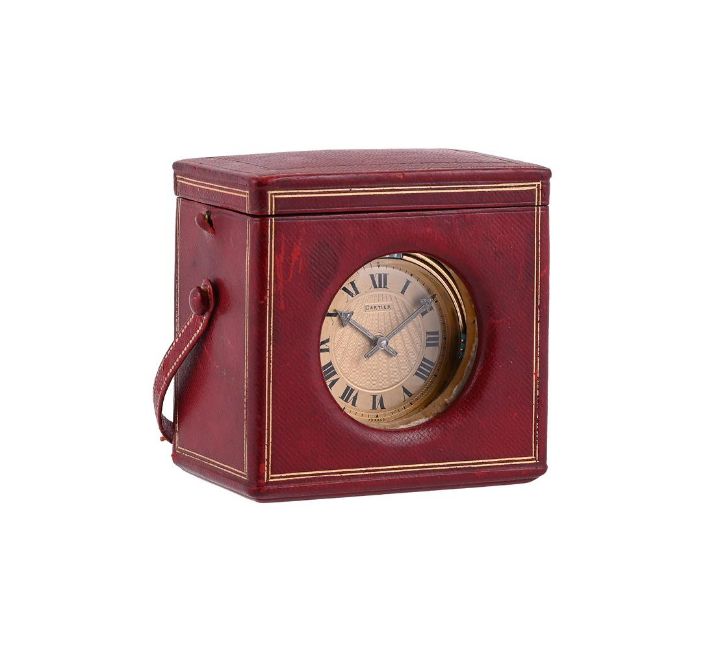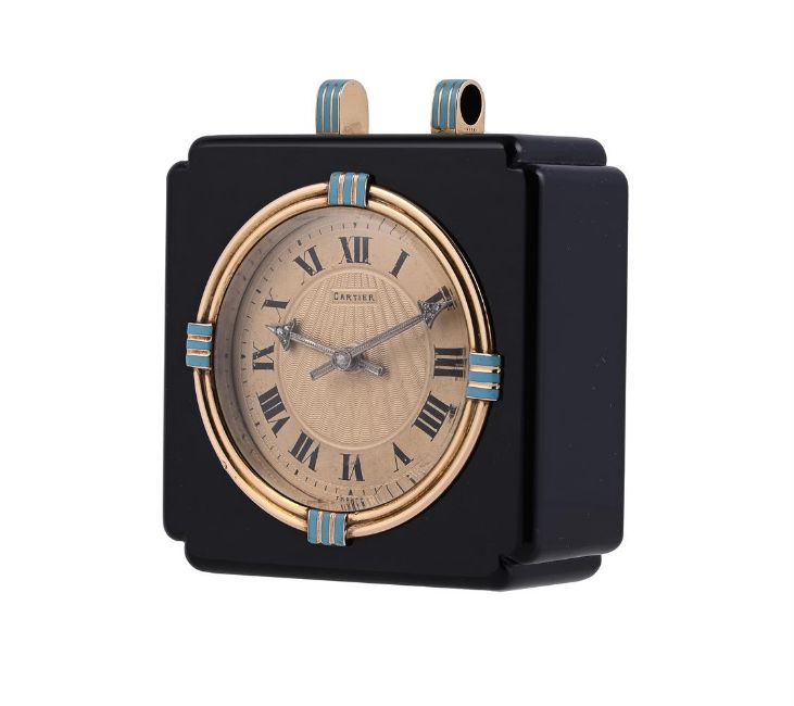 CARTIER, AN ONYX, GOLD AND ENAMEL TRAVEL DESK CLOCK, NO. 6326 CIRCA 1925The circular gilt dial with engine turned centre and black Roman numerals, signed Cartier France, with rose cut diamond set arrow hands, with a reeded gold bezel with turquoise straited enamel at the cardinal points, within a polished square onyx case with shaped corners, with turquoise blue enamelled loops, numbered 6326 and stamped with French poinçons, manual wind movement, in original Cartier red leather travel case with window, stamped Cartier Made in France, numbered 2674Size/dimensions: 6.3cm wide Provenance: From the Estate of Mrs Renée Robeson, (née de Rothschild), 1927-2015By family decent and sold by order of a member of the de Rothschild FamilyRenée Louise Marie de Rothschild (1927-2015) was the daughter of Anthony Gustav de Rothschild and Yvonne Lydia Louise de Rothschild (née Cahen d'Anvers). In 1955 Renée married the British equestrian and Olympic show jumping medallist Peter Robeson. Together Peter and Renée became hugely successful racehorse trainers from their stud at Tyringham in BuckinghamshireCondition Report: Movement currently functioningWe have been unable to access the movementHandle missingSome marks to the dial, some wear to the numeralsMinor scuffs to the case, there is a scratch to the back of the case by the winderHands appear in good conditionLight scratches to the glass visible under a loupeNo paperwork Condition Report Disclaimer