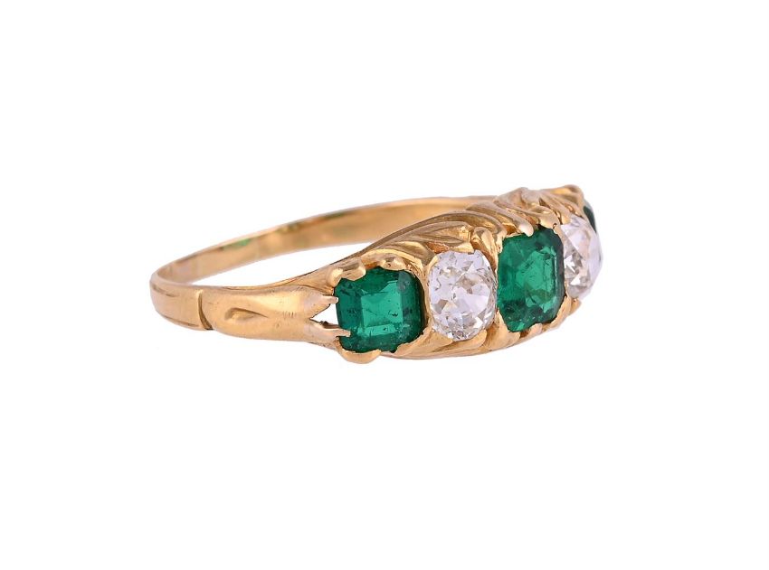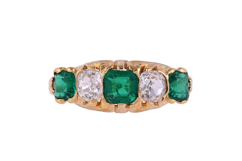 A LATE VICTORIAN EMERALD AND DIAMOND FIVE STONE RINGThe three step cut emeralds with canted corners, interspaced with two old mine cut diamonds, to a scrolled foliate gallerySize/dimensions: finger size RGross weight: 3.7 grams Condition Report: The emeralds have wear, they have abrasion and some chipping, the shank has been sized and has thinning, and the claws have thinning and have been retipped. The diamonds are bright and lively, colour estimated H, clarity SI-I, some small inclusions, assessed in the settings.Condition Report Disclaimer
