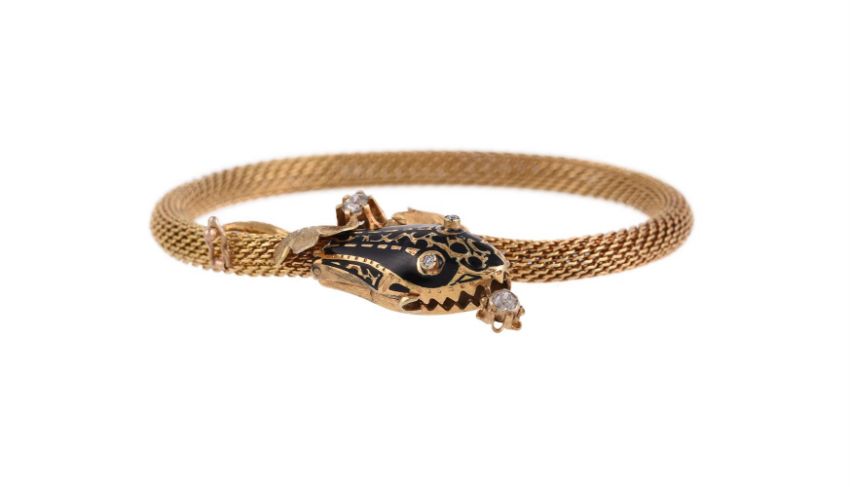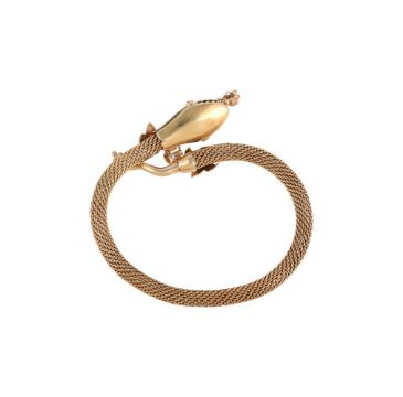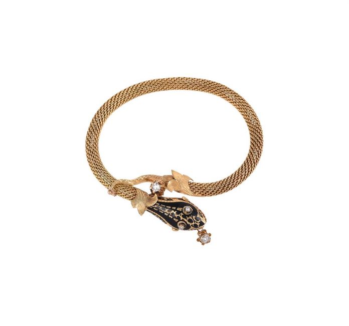 A MID 20TH CENTURY DIAMOND AND BLACK ENAMEL SERPENT BRACELETThe head with black enamelled decoration, with mixed cut diamond eyes, and two old mine cut diamond accents, approximately 0.24 carats total, to a woven link bracelet with etched foliate panel accents, hook and clip claspSize/dimensions: bracelet length 19cm, total length 23cm longGross weight: 21.6 gramsCondition Report: The bracelet is well articulated, the snakes head has a small spilt underneath and up along one of the sides, some solder along the horizontal line of the head it almost looks like the head may have once opened. The clasp is working well, the diamonds are present and correct, bright and lively. The bracelet is not marked, acid has been put on the split and there is no reaction indicating taht it is indeed gold, however we do not want to use the higher carat acid as it will mark to surface, and we do not want to scratch an area of the bracelet for testing as it is such a destructive testCondition Report Disclaimer