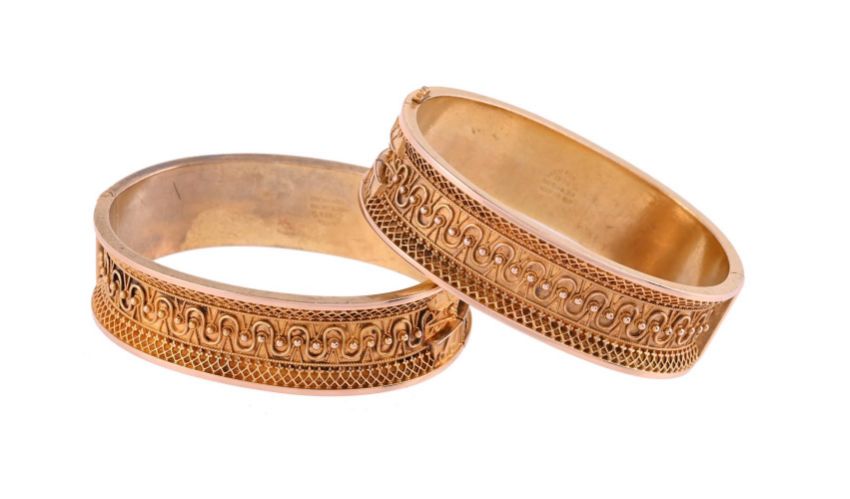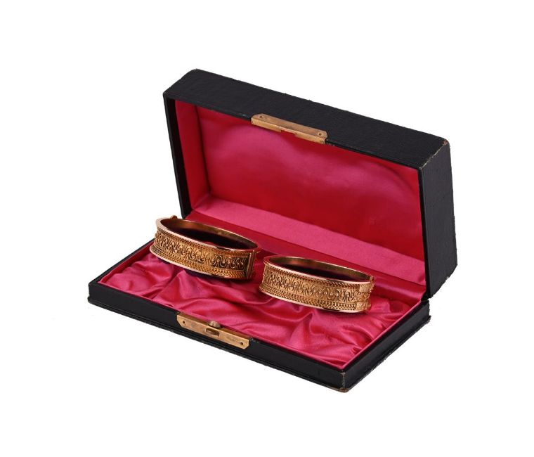A PAIR OF VICTORIAN GOLD ETRUSCAN STYLE BANGLES CIRCA 1880The broad bangles with applied woven wire and bead detail, to pierced lattice borders, the insides of the bangles stamped PAT'D FEB 25 1879 OCT 14 79 MAY 18 80, with scrolled initials 'J.C.T.', with push release button clasp, in a leather covered caseSize/dimensions: inner width 5.5cmGross weight: 45.8 gramsCondition Report: There is some surface wear and scratches, some of the mercury gilding has rubbed off on the sides of the bangle, there is a tiny piece of wire decoration missing, and a bead to the back of one of the bangles has a small hole worn in. There is a knock to the back of the other bangle. The bangle fastenings are in good working order. There are initials engraved to the inside of the bangles. The box has been relined with pink fabric, there is scuffing and scratches to the leather outer case. The bangles inner circumference is approximately 16.5cm. They are 1.6cm wide.Condition Report Disclaimer