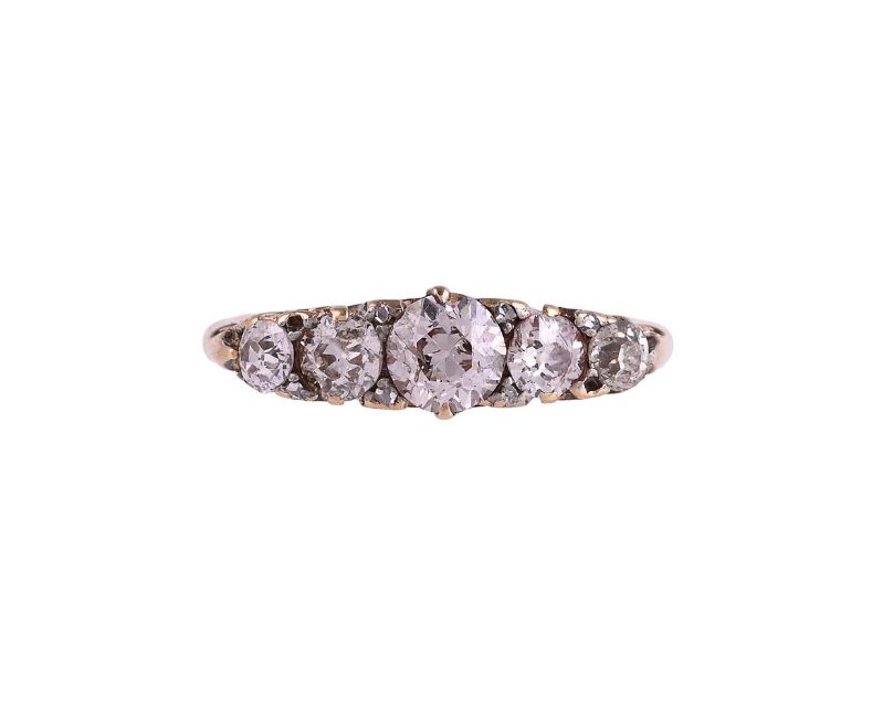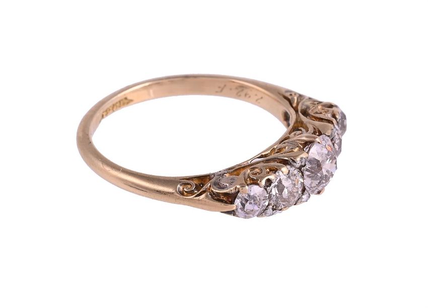 A DIAMOND FIVE STONE RINGThe graduated old brilliant cut diamonds with rose cut diamond points between, approximately 1.10 carats total, to a pierced and scrolled setting, the shank stamped 18ctSize/dimensions: finger size N 1/2Gross weight: 3.5 gramsCondition Report: The diamonds colour estimated I-M, clarity varying, central diamond colour I-J, clarity I2surface reaching fracture. The setting is late Victorian, but it has numerous repairs including replaced claws, the setting is missing two diamond points. there is a control mark 2.92.F to the inside of the shankCondition Report Disclaimer