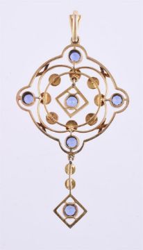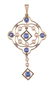 AN EDWARDIAN SAPPHIRE AND HALF SEED PEARL PENDANT CIRCA 1910The pierced quatrefoil pendant set with circular cut sapphires at the cardinal points and to the centre, with hoop of half seed pearl accents, suspending an articulated seed pearl and sapphire drop, with a rubbed stamp versoSize/dimensions: 5.2cm longGross weight: 3.5 grams Condition Report: Some light wear commensurate with age and use, the sapphires are all well matched, bright and livelyCondition Report Disclaimer
