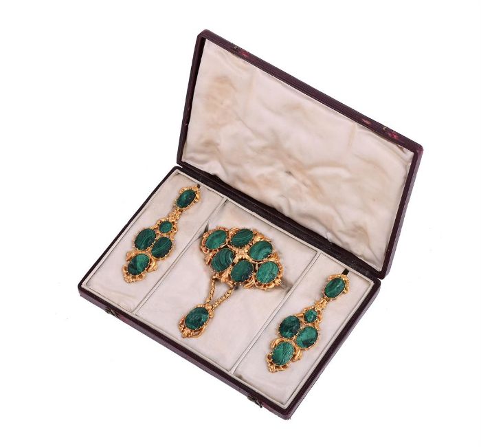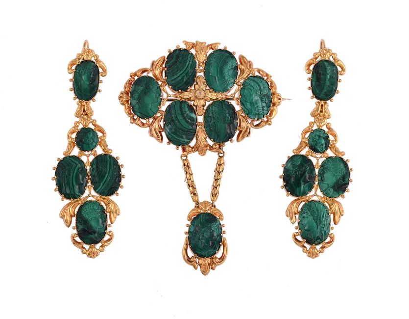 AN EARLY 19TH CENTURY MALACHITE CAMEO AND GOLD BROOCH AND EARRING SUITE CIRCA 1820The brooch with a cluster of oval malachite panels carved with the profiles of various Greek/Roman gods and hero's, including Bacchus and a bacchante, Venus, Hera and Demeter and Apollo, with gold foliate detail, with a malachite cameo with the profile of Ares suspended from a gold serpent link chain, the gold and malachite cameo ear pendants with removable panel drops, the cameos including Flora, putti, Hercules, Mercury, Hestia in pierced foliate and beaded panels, in an original silk lined leather caseSize/dimensions: brooch 6cm wide, ear pendants 8.1cm longGross weight: 43.9 gramsCondition Report: Earrings: Pediments- the earring pediment settings have some wear commensurate with age and use. The hook fittings are well hinged and in working order, they hook into closed position well. One of the malachite panels has a chip to the top partially under the setting, the chip is still in situ. Some slight rubbing to high reliefDrop panels- one of the panels has a damaged malachite panel to the base, it has been cracked and glued into place. The top small circular panel also has a small fracture and chip by the putti's face. The other panel has a small possible chip to one side under some dried resinBrooch: the snake link drop chains have some bends out to the sides of the drop links, but no noticeable losses there is a hook supporting the chains that has been resoldered into place. There is some bending and a split to the flaring gold pediment to the top of the brooch. There is a glued break to one of the top malachite panels, some small fractures and small chips to the borders of the a couple of the other malachite panels to the edges of the brooch.Wear to the case as commensurate with age and use. some marks and discolouration to the interior, some scratches and marks to the outer case. Condition Report Disclaimer