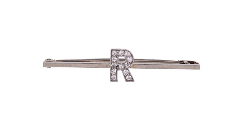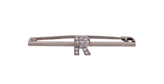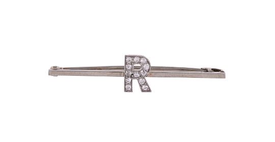 A DIAMOND SET INITIAL BAR BROOCH FIRST HALF OF THE 20TH CENTURYThe eight cut diamond set R, approximately 0.08 carats total, set on a polished barSize/dimensions: 3.9cm longGross weight: 2.4 gramsProvenance:By family descent and sold by order of a member of the de Rothschild FamilyRenée Louise Marie de Rothschild (1927-2015) was the daughter of Anthony Gustav de Rothschild and Yvonne Lydia Louise de Rothschild (née Cahen d'Anvers). In 1955 Renée married the British equestrian and Olympic show jumping medallist Peter Robeson. Together Peter and Renée became hugely successful racehorse trainers from their stud at Tyringham in Buckinghamshire Condition Report: Diamonds bright and lively, some wear commensurate with age and use the brooch pin is slightly bentCondition Report Disclaimer