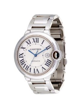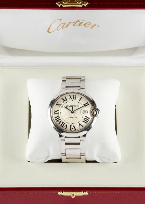CARTIER, BALLON BLEU, REF. 3000AN 18 CARAT WHITE GOLD BRACELET WATCH WITH DATE, NO. 121869LX, CIRCA 2008Movement: Cal. 049 ETA 2892A, automatic, 21 jewelsCase: 18 carat white gold case, screwed down case back with eight screws, stamped with 18 carat gold common control markDial: SilveredBracelet: Cartier 18 carat white gold bracelet with concealed clasp Size: 42mm, bracelet 19cmSigned: Case, dial, movement, crown, claspAccessories: Cartier box, guarantee booklet, information booklet, DVD, outer card packaging When most people think of Cartier watches, the first watch that comes to mind is the Tank with its square case. Cartier introduced the Ballon Bleu to the world in 2007 with its circular case. The Ballon Bleu is set with the unmistakable Cartier blue cabochon crown, which is protected by the crown guard at 3 o'clock. This is a versatile model that can be worn on any occasion by men and women. The Princess of Wales is often spotted wearing a 33mm stainless steel example. Condition Report: Movement is currently functioning. Movement appears to be in a generally good condition with little sign of previous intervention when viewed under a 4x loupe. Dial appears to be in a generally good condition with no marks visible when viewed under a 4x loupe. Hands appear to be in a generally good condition.Glass appears free of significant scratches or marks when viewed under a 4x loupe. Case shows light scratches and marks. Crown has light scratches when viewed under a 4x loupe. Bracelet has light scratches and some signs of light stretching to links. Clasp is currently functioning and shows light scratches and marks. 234g grossBracelet measures approximately 19cm including case.This lot comes with a box and papers dated .Dreweatts 1759 do not guarantee the working order or accuracy of any lots sold. Due to opening of the case back we recommend this watch is re-sealed by a qualified technician to ensure any stated water resistance is achieved.If you should have any further questions regarding this lot, please contact the Watch Department on 01635 553 553 or at watches@dreweatts.com           Condition Report Disclaimer