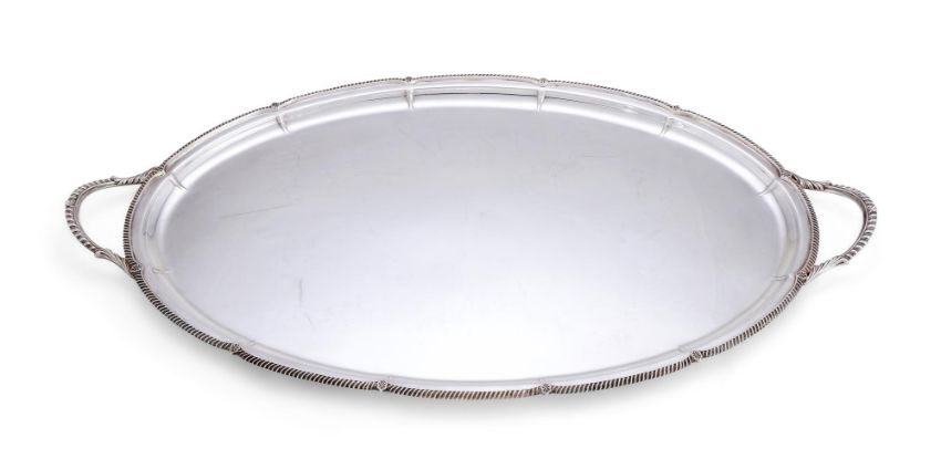 A LATE VICTORIAN SILVER SHAPED OVAL TWIN HANDLED TRAYHARRISON BROTHERS & HOWSON, SHEFFIELD 1897With twin gadrooned loop handles issuing from foliage, a gadrooned border with leaves at intervals 65.5cm (25 3/4in) long2259g (72.6 oz) Condition Report: Marks are clearNo engravingLight scratches and wear commensurate with age and useCondition Report Disclaimer