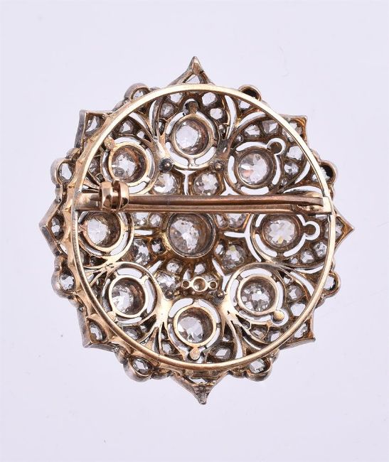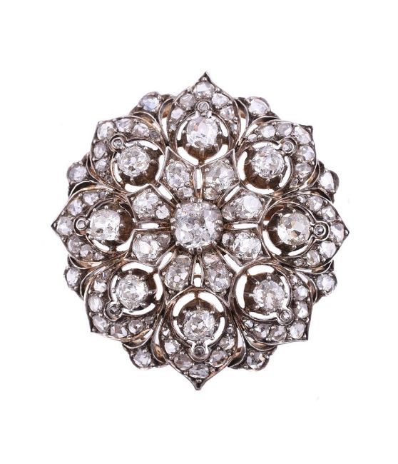 A LATE VICTORIAN FLOWER HEAD CLUSTER BROOCHCIRCA 1890The pierced radiating flower head set with old mine cut diamonds, approximately 5.15 carats total, with an outer border of graduated rose cut diamonds, in gold backed silver settingsSize/dimensions: 4.1 cm diameterGross weight: 18.5 grams