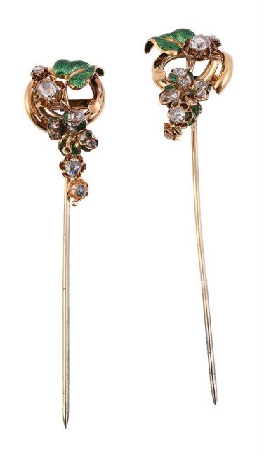A PAIR OF FRENCH 19TH CENTURY DIAMOND SET HAIR PINSWith scrolling green enamelled leaf and rose cut diamond accents, suspending rose cut diamond drops in raised claw settings, the tops with French import poinçons, the pins with French boars head poinçons Size/dimensions: the terminals 3.6cm long including dropsGross weight: 15.6 gramsCondition Report: There are a couple of small dents to the gold sections, there are some chips to the green enamel, the diamonds are all present and correct, bright and lively for rose cutsCondition Report Disclaimer
