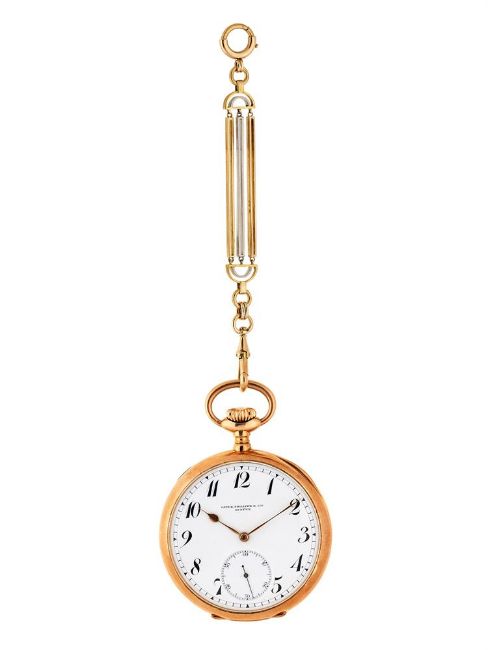 PATEK PHILIPPE & CIEA GOLD KEYLESS WIND OPEN FACE POCKET WATCH, NO. 273556, CIRCA 1920Movement: Swiss moustache lever, bimetallic split balance, overcoil balance springCase: Gold four piece hinged case, the cuvette engraved 'Fabriquee specialement pour Louis Hainz Prague par Patek Philippe & Cie Geneve', stamped 0.585 with a poinçonDial: WhiteSize: 52mmSigned: Case, dial, movementAccessories: Two colour gold fob, 1872 - 1922 Prague 580/1000 markCondition Report: Movement is currently functioning. Movement has scratches, marks and tarnishing commensurate with general wear visible when viewed under a 4x loupe. Dial appears to be in a generally good condition with no marks visible when viewed under a 4x loupe. Hands show marks and tarnishing when viewed under a x4 loupe. Glass has some scratches and marks when viewed under a 4x loupe. Case shows light scratches and marks. Hinges appear intact.Crown screws down and has light scratches when viewed under a 4x loupe. Pocket watch - 96g grossFob - 11gThis lot does not come with box or papers.Dreweatts 1759 do not guarantee the working order or accuracy of any lots sold. Due to opening of the case back we recommend this watch is re-sealed by a qualified technician to ensure any stated water resistance is achieved.If you should have any further questions regarding this lot, please contact the Watch Department on 01635 553 553 or at watches@dreweatts.com             Condition Report Disclaimer