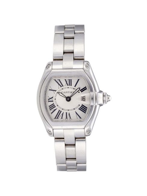 CARTIER, ROADSTER, REF. 2675A STAINLESS STEEL BRACELET WATCH WITH DATE, NO. 254670BB, CIRCA 2010Movement: QuartzCase: Stainless steel case, screwed down case back with four screws Dial: SilveredBracelet: Cartier stainless steel bracelet with concealed clasp Size: 33mmSigned: Case, dial, movement, claspAccessories: None