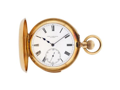 JOHN CASHMORE, LONDON AN 18 CARAT GOLD KEYLESS WIND QUARTER REPEATING FULL HUNTER POCKET WATCH, NO. 6965, CIRCA 1893Movement: Three quarter plate, bimetallic split balance, lever escapement, repeater workCase: 18 carat gold five piece engine hinged case, engine turned covers, the front cover with a blue enamel Roman numeral chapter ring, the back cover engraved with a crest within a circular reserveDial: WhiteSize: 50mmSigned: Dial, movementAccessories: Unsigned boxCondition Report: Movement is currently functioning. Repeating work functioningMovement appears to be in a generally good condition with little sign of previous intervention when viewed under a 4x loupe. Dial appears to be in an average condition with some light marks and scratches when viewed under a 4x loupe. Hairline crack to the centre of the dialHands show marks and tarnishing when viewed under a x4 loupe. Glass has some scratches and marks when viewed under a 4x loupe. Case shows light scratches and marks. Engine turning rubbedHinges appear intact.Crown has light scratches when viewed under a 4x loupe. 129g grossThis lot does not come with box or papers.Dreweatts 1759 do not guarantee the working order or accuracy of any lots sold. Due to opening of the case back we recommend this watch is re-sealed by a qualified technician to ensure any stated water resistance is achieved.If you should have any further questions regarding this lot, please contact the Watch Department on 01635 553 553 or at watches@dreweatts.com             Condition Report Disclaimer