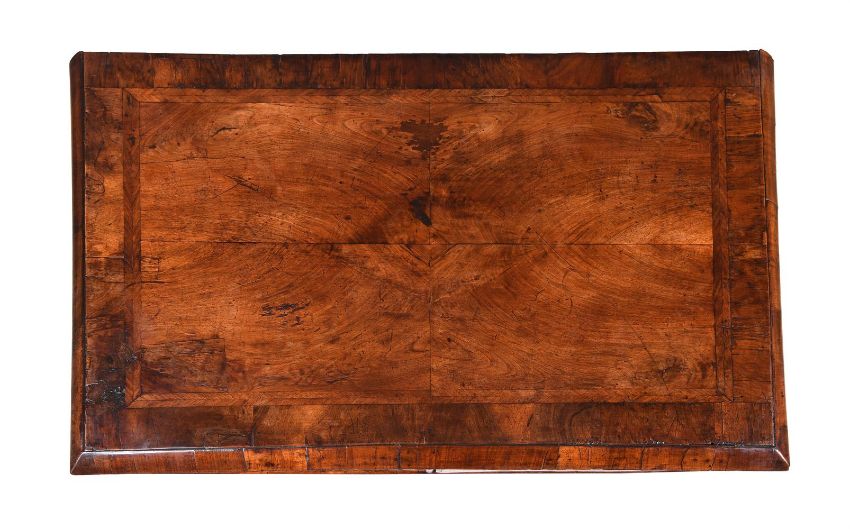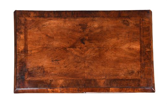 A WILLIAM & MARY FIGURED WALNUT AND FEATHER BANDED CHEST OF DRAWERSCIRCA 1690On turned bun feet91cm high, 95cm, 58cm deepCondition Report: Marks, knocks, scratches and abrasions commensurate with age and use. Various old splits and chips. Various old repairs and sections of replacement - see images. Handles and escutcheons and later replacements but are in period taste. No key present, all locks are open. Evidence of old worm in places throughout. Dark filler has been used to help disguise in some areas. Backboards have age but are replacements. Turned feet and the batons of timber to the underside are applied to are also replacements. A dark wash has been applied to the back and underside. Some splits/opening to drawer linings. Please refer to additional images for visual reference to condition. Condition Report Disclaimer