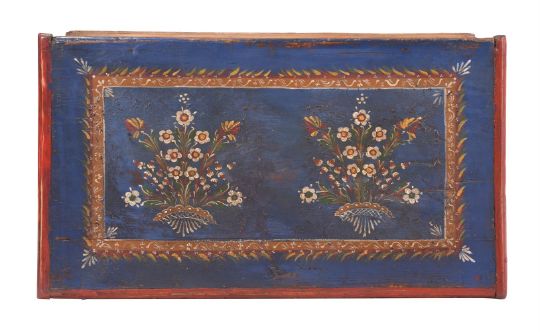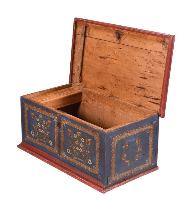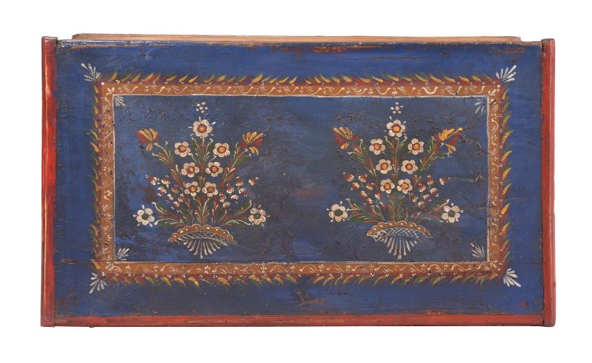 A POLYCHROME PAINTED PINE CHESTPROBABLY SCANDINAVIAN, 19TH CENTURY44cm high, 98cm wide, 56cm deepProvenance: Private Collection, KentCondition Report: Chest with the marks, knocks, scratches and abrasions commensurate with age and use. Some old splits and chips. Painted surface is later applied to the chest. It has the expected wear and losses. It is difficult to date when this painting happened. Evidence of old worm resulting in some losses. No key present but lock is open. One wire hinge lacking. Please refer to addition images for visual reference to condition. Condition Report Disclaimer