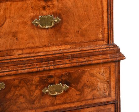 A QUEEN ANNE WALNUT AND FEATHER BANDED CHEST ON CHESTCIRCA 1710178cm high, 105cm wide, 58cm deepProvenance: Private Collection, GloucestershireA closely related chest on chest was sold from the collection of the late Roger Warner, Christie's London, 21st Jan 2009, lot 75. £16,250.Condition Report: Marks, knocks, scratches and abrasions commensurate with age and use. Old splits and chips. Old veneer and moulding repairs throughout - see images. Some filler/dark wax used in places. Handles and escutcheons are old replacements and suit the piece well.Locks are old replacements. No key is present but all locks are open. The two lowest drawers have been converted into a single deep drawer.Some evidence of old worm to top, backboards and underside. The backs of both front feet are lacking the supporting blocks. All feet with some sections of replacement inset timber - see images. The backboards have a black wash applied over them and strips of fabric applied to the joins. Please refer to additional images for visual reference to condition.Condition Report Disclaimer