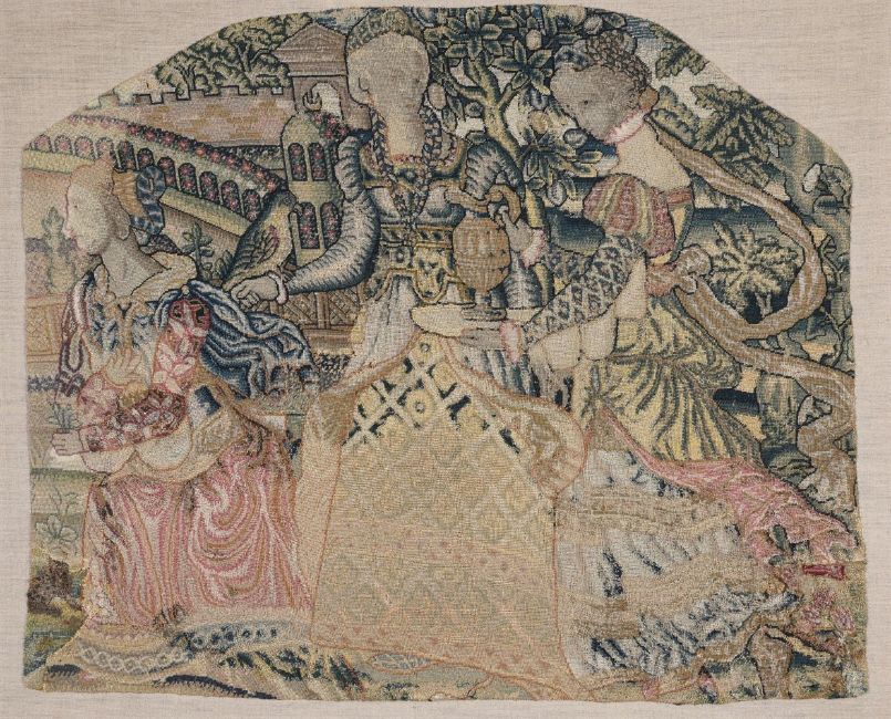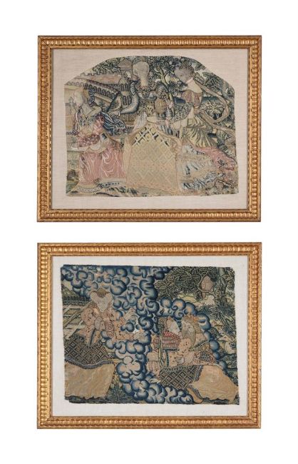 TWO FRAMED COURTLY SCENE NEEDLEWORKS LATE 16TH/EARLY 17TH CENTURY Both fragments, now on canvas ground, modern framed and glazed, the first with scene of pastoral love, figures within garden setting, the second with noble woman with attendants, pet bird on her wrist both panels 54.5 x 66cm, the frames 73.5 x 85cm and 72 x 87cm Provenance: Private Collection, Hampshire Condition Report: Wear, marks, knocks edge/gilt losses and scratches to frames as per age, handling, use, and cleaning. The needleworks both fragments- so with trimmed/tidied edges, colour muting- both unexamined out of glass but visible signs of old spot repairs and restitching. Small areas of loss and rubbing Please see additional images for visual references to condition which form part of this condition report.All lots are available for inspection and Condition Reports are available on request. However, all lots are of an age and type which means that they may not be in perfect condition and should be viewed by prospective bidders; please refer to Condition 6 of the Conditions of Business for Buyers. This is particularly true for garden related items.We must advise you that we are not professional restorers or conservators and we do not provide any guarantee or warranty as to a lot's condition. Accordingly, it is recommended that prospective buyers inspect lots or have their advisors do so, and satisfy themselves as to condition and accuracy of descriptionAll lots are offered for sale "as viewed" and subject to the applicable Conditions of Business for Buyer's condition, which are set out in the sale catalogue and are available on request. Buyers are reminded that liability for loss and damage transfers to the buyer from the fall of the hammer. Whilst the majority of lots will remain in their location until collected, we can accept no responsibility for any damage which may occur, even in the event of Dreweatts staff assisting carriers during collection. Condition Report Disclaimer