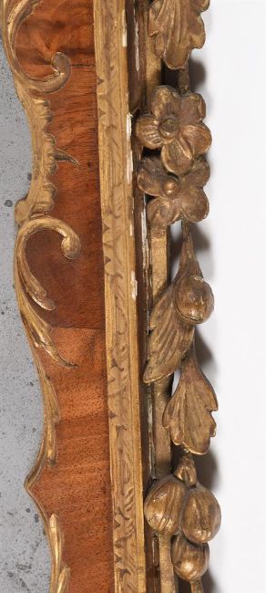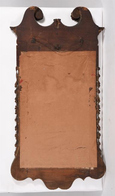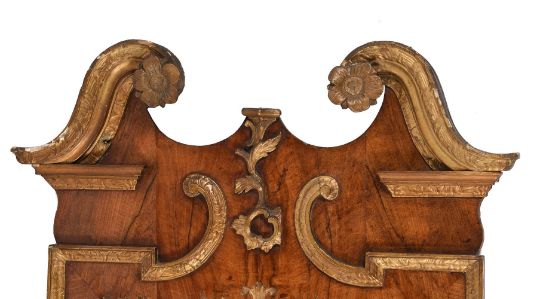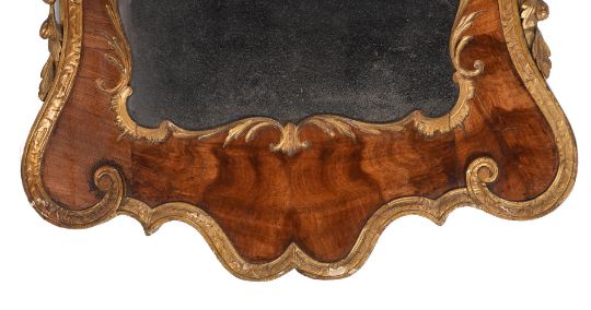 A GEORGE II FIGURED WALNUT AND PARCEL GILT WALL MIRRORSECOND QUARTER 18TH CENTURY121cm high, 63cm wide, 7cm deepCondition Report: There are scratches, cracks, scuffs and knocks consistent with age and use.There are losses, restorations and observations including:Some cracks and repairs to veneers. There are knocks and chips including to the tips of some carved flowers, edges and elsewhere. The flowerheads to the architectural crest have a darker finish, suggesting that they could be of a later date or later painted.The gilding with some knocks revealing the underlying gesso or wood; the patina of the gilding generally a blend of matt/dull with some traces of brighter gilding, some later gilding, some flaking.The back of the mirror has been later covered with brown paper; there is some evidence of worm to the back; void holes and later metal wall fixings to the back.The mirrored plate with some ageing with areas of silvering foxed or scratched, a probable shadow of aging from a a crack in a backboard. The mirror has not been inspected from the back or been removed from the frame.Please see the additional photographs as a visual reference of condition. Condition Report Disclaimer