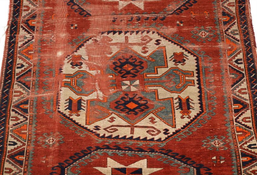 A CAUCASIAN RUGPROBABLY LORI PAMBAKapproximately 227 x 172cmProvenance: Private Collection, KentCondition Report: Wear to rug overall. Various areas of additional wear which reveal underlying weft. There is an approximately 5cm long tear and loose threads to the centre of the rug. There are also two patches of wear which have gone through the rug and cause a hole covered by strands of warp - see images. Wear has resulted in several small holes. Binding to longest edges are untidy with various losses and loose threads. Fringing is short at both ends. It has wear, fraying and losses. This wear has encroached into the guard stripe slightly at both ends. Losses and loose threads to corners. Please refer to additional images for visual reference to condition. Condition Report Disclaimer