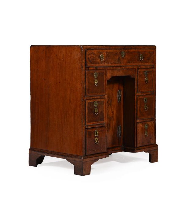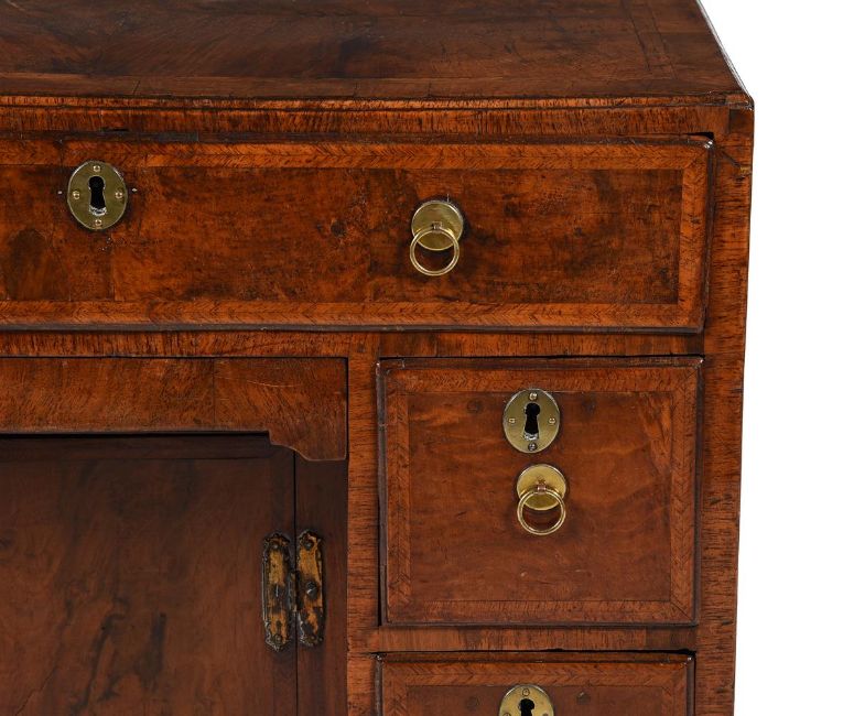 A GEORGE II WALNUT AND FEATHER BANDED KNEEHOLE DESKCIRCA 173578.5cm high, 74cm wide, 48cm deepProvenance: Private Collection, London Condition Report: There are scuffs, scratches, knocks, cracks and abrasions consistent with age and use.There are losses, restorations and observations including:Veneer replacements and some veneers lacking, some colour/filler; the surface with a varnish type finish - visible mostly from where it is lacking in some places.The sides with some cracks.The oak drawer linings with some cracks; the handles and escutcheons later; the later locks with a key to operate the long drawer lock and kneehole door; the other locks are open; the top drawer with later runner sections to the carcass.There is evidence of worm. The feet variously restored with some later blocks, wood and veneers.Please see the additional photographs as a visual reference of condition.  Condition Report Disclaimer