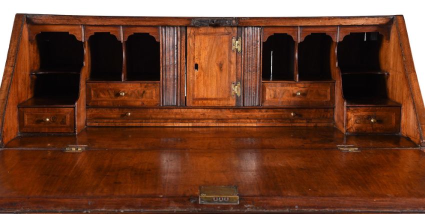 A GEORGE II WALNUT BUREAUCIRCA 1735The hinged fall opening to a fitted interior incorporating concealed compartments 105cm high, 96cm wide, 52cm deepCondition Report: There are scratches, knocks, cracks and abrasions.There are losses, restorations and observations including:There is some bowing and undulations including to the top, the fall, drawer front and the interior surface in front of the fittings.The backboards have some later staining. Some later elements to the feetVeneer and moulding losses and repairs, some use of filler. There is some evidence of worm.There are oak linings to the drawers and interior drawers with some splitting.Some cracks and losses to the brass escutcheons; the locks later but of some age, there is no key.Please see the additional photographs as a visual reference of condition. Condition Report Disclaimer