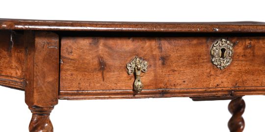 A CHARLES II WALNUT SIDE TABLECIRCA 166074cm high, 89cm wide, 52cm deepProvenance: Private Collection, LondonAcquired from Sothebys, Important English Furniture, June 13th 2001, Lot 88 (£9,600)This table is a rare and sophisticated survival being constructed entirely from 'walnut tree' rather than the more commonly found oak examples.Condition Report: Marks, knocks, scratches and abrasions commensurate with age and use. Various old chips, splits and losses. Evidence of old worm to areas throughout resulting in some fragmentary losses. Some dark wax/filler used to disguise this in places. Several securing pegs visible to the top. Handles and escutcheon are replacements but suit the piece well. Lock is possibly original. No key is present but lock is open.Strip of later tape applied to underside of drawer. A small section of moulding has also been applied to underside of drawer as a handle. Drawer runners to the interior of the carcass have age but are replacements. There is also a baton of later timber inset into one side of the drawer. Various old repairs to legs and stretchers. One rear leg has a section of replacement turned timber inset - see images.Please refer to additional images for visual reference to condition.Condition Report Disclaimer