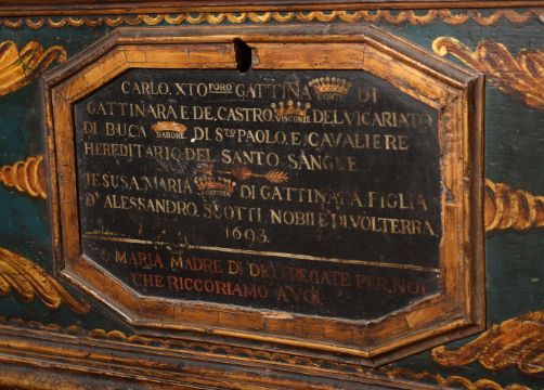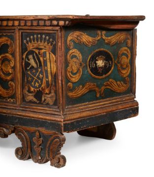 AN ITALIAN WALNUT AND POLYCHROME PAINTED CASSONE