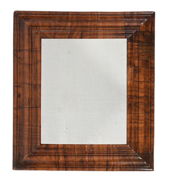 A WILLIAM & MARY FIGURED WALNUT CUSHION FRAMED MIRRORCIRCA 169047cm high, 41cm wideProvenance: Private Collection, BerkshireCondition Report: Marks, knocks, scratches and abrasions commensurate with age and use. Old splits and chips. Old veneer and moulding repairs, including some sections of - see images. Bevelled mirror plate might be a later replacement, suggested by the later backboard, but the mirror plate looks hand made. It has some minor depletion and grey spots.A later hinged support and hanging wire has been added to the back of the mirror. Evidence to the back that the mirror originally had a cresting which is now lacking. There is evidence of worm.Please refer to additional images for visual reference to condition. Condition Report Disclaimer