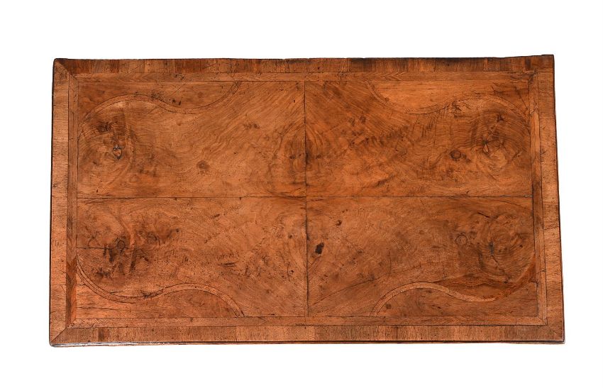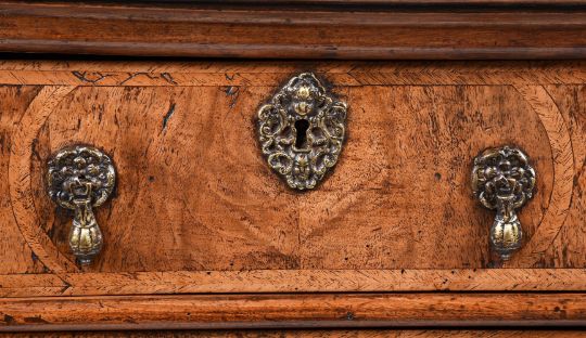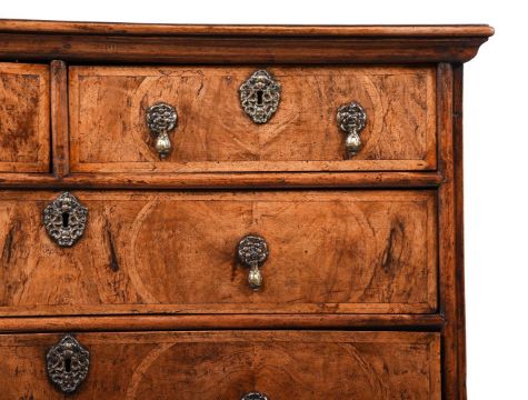 A WILLIAM & MARY WALNUT AND FEATHER BANDED CHEST OF DRAWERSCIRCA 169092cm high, 97cm wide, 59cm deepProvenance: The Collection of Michael SimCondition Report: Marks, knocks, scratches and abrasions commensurate with age and use. Old splits, chips and some losses. Evidence of old worm. Some old veneer repairs - see images. Sun fading in areas. Lock plate to lower drawer is lacking. No key is present but all locks are open. Handles and escutcheons are old replacements. They are in period taste, suit the piece well and use the same holes as previous fixtures. Turned bun feet have age but are replacements. Block of later timber have been added to increase the height of the stile feet to the back. Some small patches of later tape to backboards. Please refer to additional images for visual reference to condition. Condition Report Disclaimer