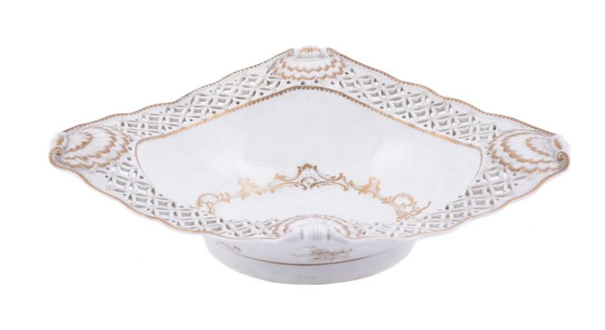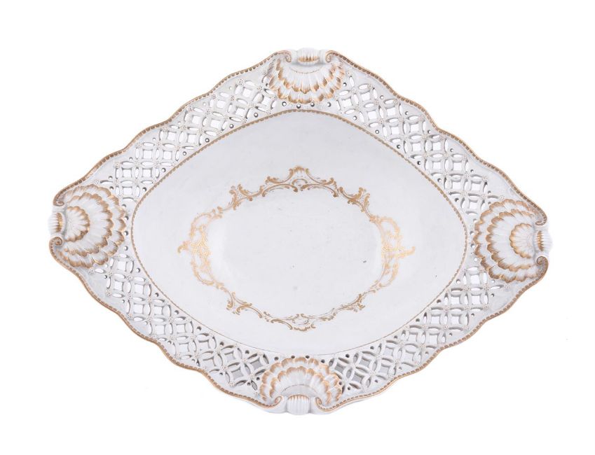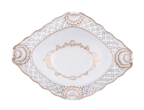 A WORCESTER PIERCED LOZENGE-SHAPED SALAD BOWLCIRCA 1770The well decorated en rocaille with an oval band of C-scrolls, the pierced bordered rim modelled with four shell terminals, paper labels for the Sir Jeremy Lever Collection and the Zorensky collection (Y.699), 39cm in lengthSee Spero & Sandon, WORCESTER PORCELAIN 1751-1790 The Zorensky Collection (1996) fig. 400 and Bonhams, The Zorensky Collection Part I, 16th March 2004, lot 227 for this basket.Condition Report: Restored section to rim.Condition Report Disclaimer