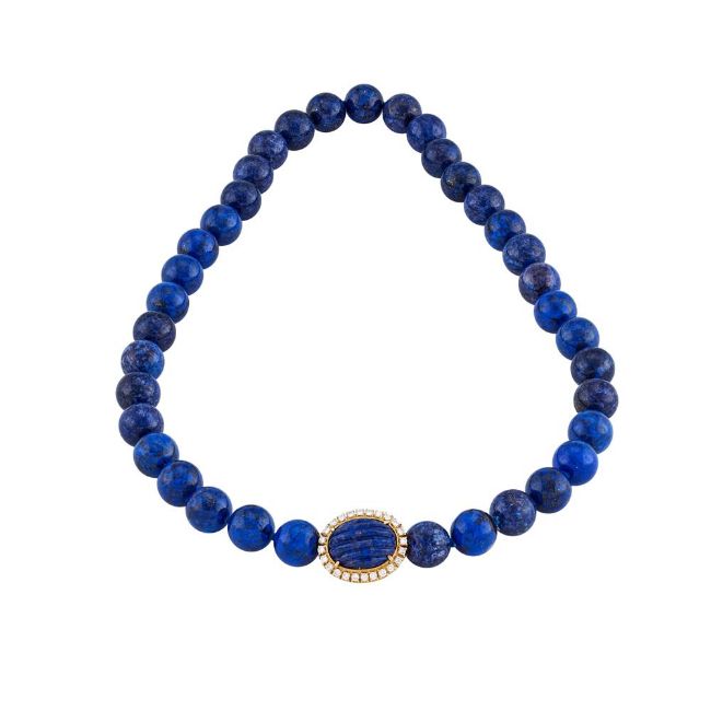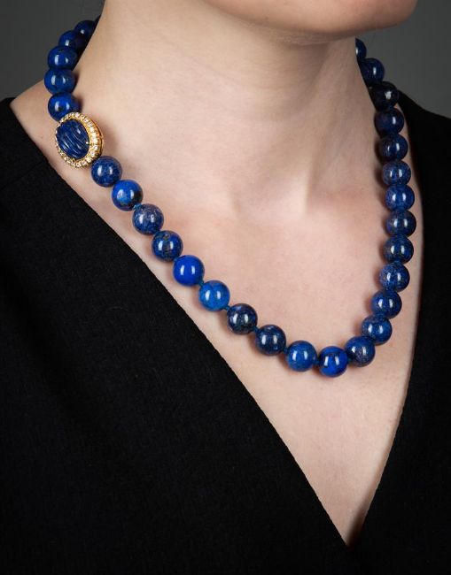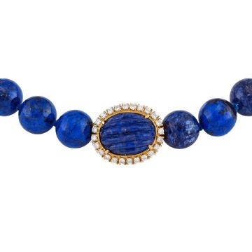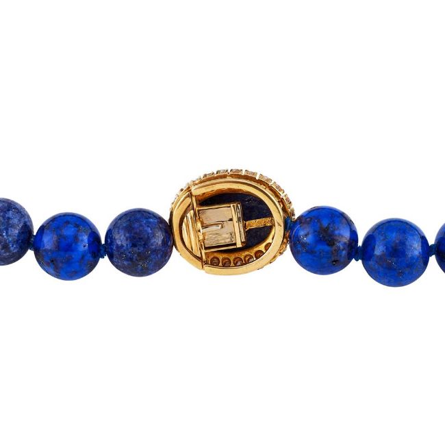 MISSIAGLIA, A DIAMOND AND LAPIS LAZULI NECKLACEThe uniform polished lapis lazuli beads to a reeded oval lapis lazuli and brilliant cut diamond cluster clasp, approximately 0.72 carats total, the clasp signed MissiagliaSize/dimensions: beads 1.2cm diameter, clasp 2.2cm long, 50.5cm longGross weight: 113 gramsMissaglia was founded in Venice in 1846, and is now one of the oldest established jewellers n Venice. The company is still family owned and employs its own designers and skilled craftsmen to make exceptional hand made 'Gioilelli Alta' (High Jewellery)  Condition Report: The clasp tests as a higher carat gold, but it is unmarked for carat. The diamonds are all present and correct, bright and lively, colour estimated G-I, clarity mostly Vs. The colour of the lapis lazuli is slightly varying in colour tone. The clasp is in good working order.Condition Report Disclaimer