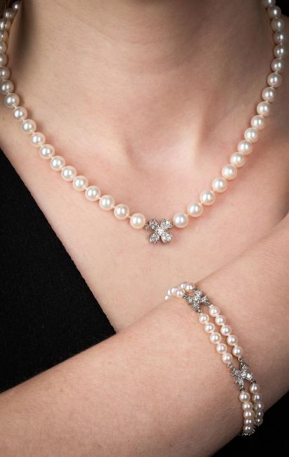 TIFFANY & CO., FLORET FLOURISHES, A DIAMOND AND CULTURED PEARL NECKLACE AND BRACELETLONDON 2000 and 2001The knotted necklace with uniform cultured pearls with a central brilliant cut diamond set platinum quatrefoil floret panel, and similar floret clasp, approximately 0.60 carats total, the clasp signed TIFFANY & CO., PT950 with maker's mark and 2000 hallmark, together with a matching Tiffany & Co. pearl and diamond bracelet, the two rows of uniform cultured pearls with diamond set quatrefoil floret spacers, approximately 0.95 carat total, signed TIFFANY & CO., PT950 with maker's mark and 2001 hallmark, both with original Tiffany & Co. pouches and cases Size/dimensions: necklace 42.5cm long, bracelet 17.3cm longGross weight: 42.5 gramsCondition Report: The necklace and bracelet would benefit from restringing some signs of slight fraying. The diamonds are all present and correct, bright and lively, colour mostly H+, clarity mostly VS-VVS. The pearls are well matched good lustre, white body colour. The clasps in good working order, however the necklace clasp has to have the pin properly put in to remain secure. The boxes have some signs of storage, and the necklace pouch has some yellow marks on it. Condition Report Disclaimer
