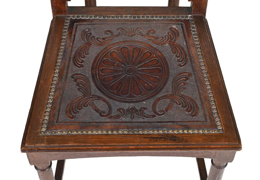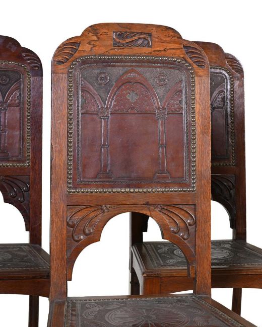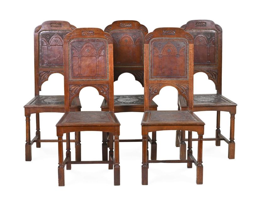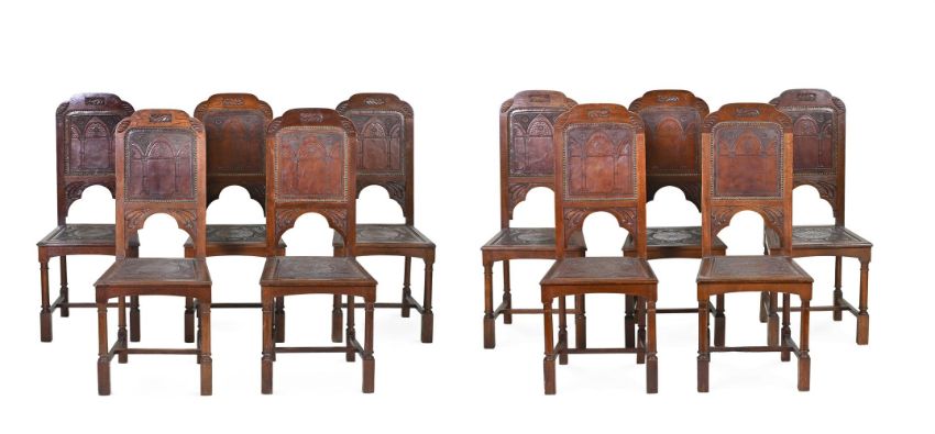 A SET OF TEN MID VICTORIAN OAK DINING CHAIRSTHIRD QUARTER 19TH CENTURY Each with an arched back with an embossed leather back and seat, on turned column legs106cm high, 44.5cm wide, 40cm deepCondition Report: Marks, knocks, scratches and abrasions commensurate with age and use.Some old chips, splits and losses.Some old repairs and replacements.One leather back with a tear and holes (see images)The leather seats and backs with some marks, knocks, scuffs and scratches.There are losses, observations and restorations including: cracks to the chair backs along sectional joints; cracks to some seats generally along the grain of the timber, some later blocks to the underside of the chairs; some repairs to feet, including some old spliced repairs, some filler use in places to disguise splits and repairs; some legs with knocks along the edges; some vacant rectangular holes to underside of some feet; some evidence of worm to seat rails and other timber elements.Please see the additional photographs as a visual reference of condition. Condition Report Disclaimer
