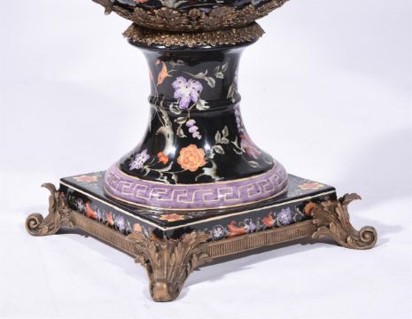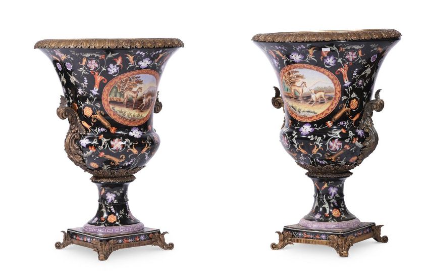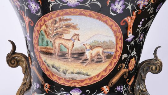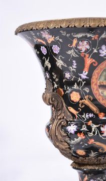 A PAIR OF ASIAN PORCELAIN BLACK GROUND URNS WITH GILT METAL MOUNTSMODERNIn a European style, 75cm high Condition Report: No damage detected.Condition Report Disclaimer
