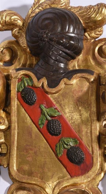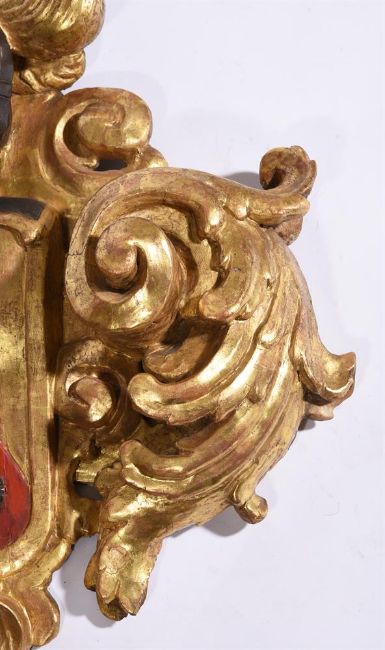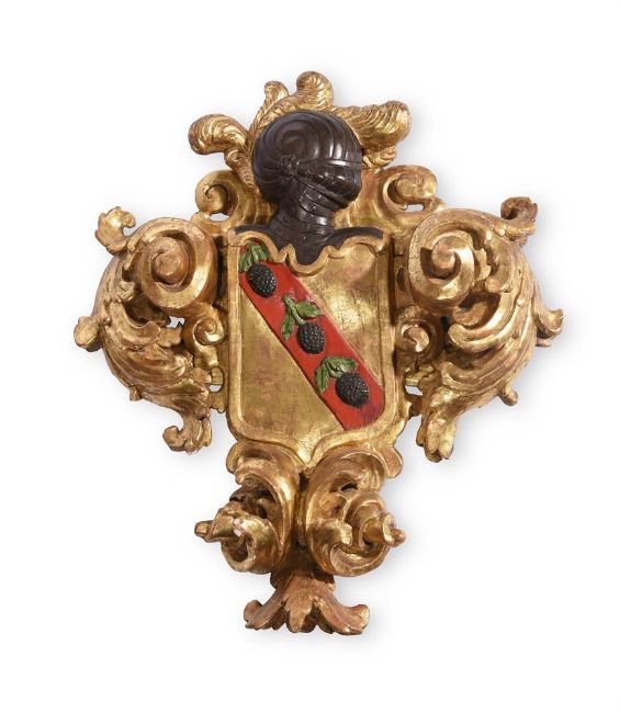 A FLORENTINE CARVED GILTWOOD ARMORIAL CARTOUCHE 18TH CENTURYWith scrolling foliage console around closed helm surmounting shaped shield with red diagonal 'bend' with three leaf capped fruits or berries 67cm high, 59cm wide Condition Report: Marks, knocks, scratches and abrasions commensurate with age and use. Old splits and chips - see images. Re-gilded and painting refreshed. Gilt surface with the expected cracking, chips and wear. Glue residue visible to the back from where one side of the cartouche has been re-attached. Two later batons of timber to the back to help secure this repair. There is also an old glued repair to lower cresting. Some minor evidence of old worm. Please refer to additional images for visual reference to condition. Condition Report Disclaimer