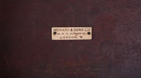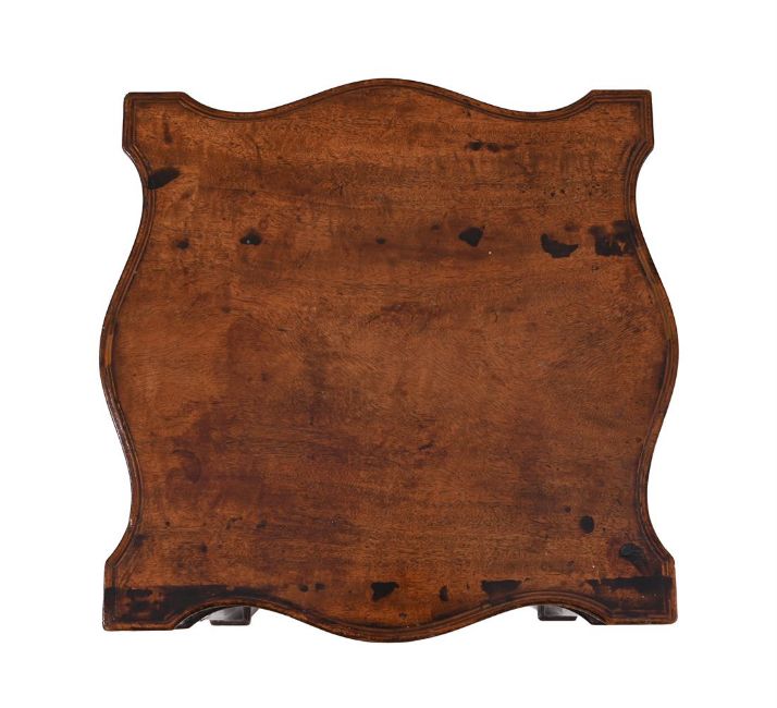 A MAHOGANY URN STAND20TH CENTURY, IN THE GEORGE II STYLE, BY HOWARD & SONS The serpentine square top above fretwork frieze on chamfered square legs with pierced angle brackets, with ivorine label 'HOWARD & SONS LTD / 25, 26, 27 BERNERS ST. / LONDON, W' and stamped 'HOWARD & SONS LTD / BERNERS ST / 19878 / 4302' 50.5cm high, 35cm square