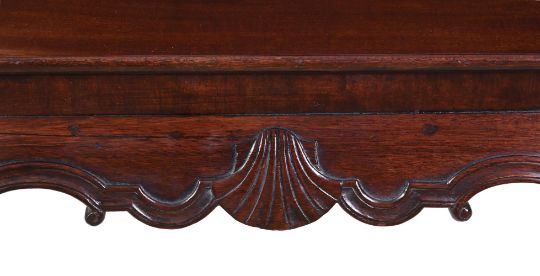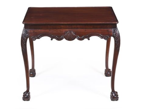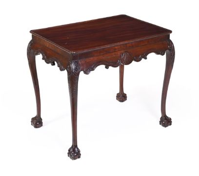 A MAHOGANY CENTRE TABLE IN MID 18TH CENTURY STYLEThe dished rectangular later top with re-entrant corners, the waved frieze centred by a shell, on cabriole legs with claw and ball feet68.5cm high, 79cm wide, 56.5cm deepCondition Report: Marks, scratches and abrasions commensurate with age and useSome old chips and splits, some minor old repairs. Of solid structureA number of additional indented marks to the top, the frieze and lipped edge of the top. Many are dark in colour and many have been disguised by colouring or filler. Some filled with very small elements of timber. Please refer to all additional images that are available to be emailed with the condition report.Condition Report Disclaimer