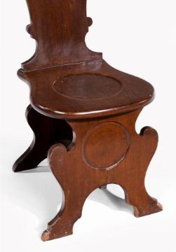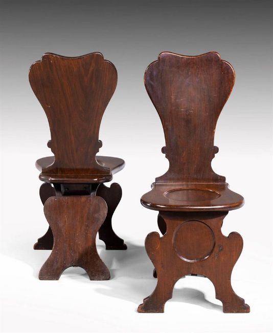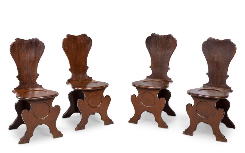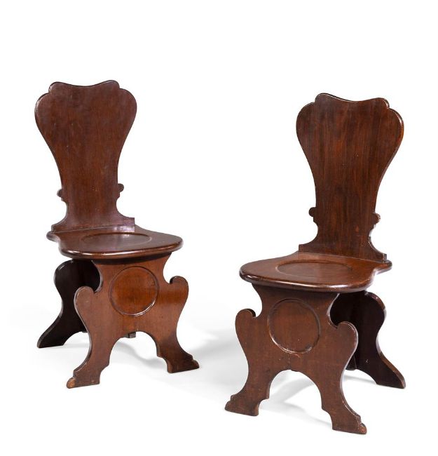 A SET OF FOUR GEORGE II MAHOGANY HALL CHAIRS MID 18TH CENTURY Of sgabello formeach 99cm high, 41cm wide, 55cm deep overall