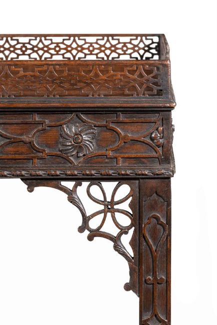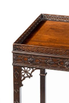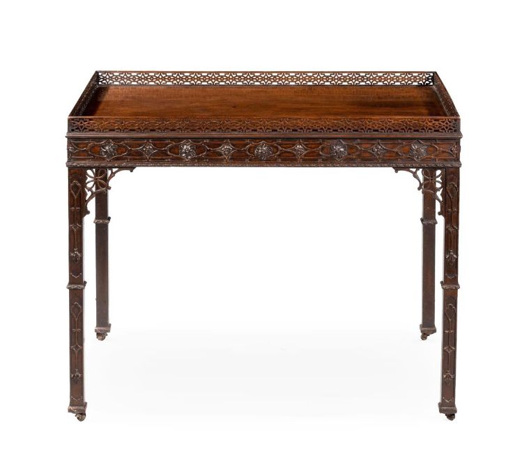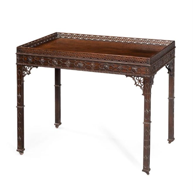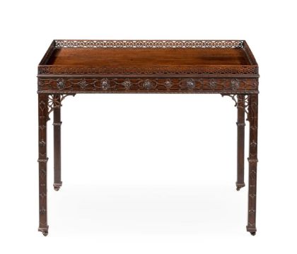 A GEORGE III MAHOGANY SILVER TABLEIN THE MANNER OF THOMAS CHIPPENDALE, THIRD QUARTER 18TH CENTURY 74.5cm high, 89.5cm wide, 59cm deepCondition Report: Table with the marks, knocks, scratches and abrasions commensurate with age and use. Some old splits and chips. Some old repair to pierced spandrels. One foot with a section of moulding lacking. One leg with three sections of moulding detached but present. Later supporting blocks to the underside of the top. Very well disguised old splits to each side of the top. There are later strips of tape to the undersides from where these have been repaired. The central stretcher to the underside of the top appears to be later, it has some minor evidence of old worm. Please refer to additional images for visual reference to condition. Condition Report Disclaimer