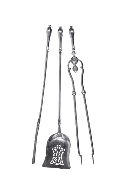A SET OF THREE STEEL FIRE IRONS19TH CENTURYComprising poker tongs and shovel, each with facetted handle and a plain shaftThe poker 74cm long